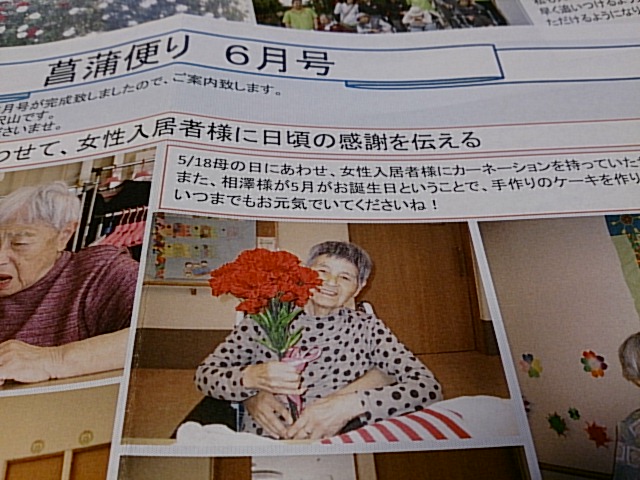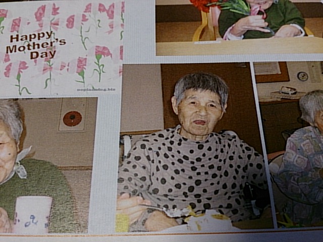 母の日にあわせて、女性入居者の方に、カーネーションを持って記念撮影をしてくださったようです。