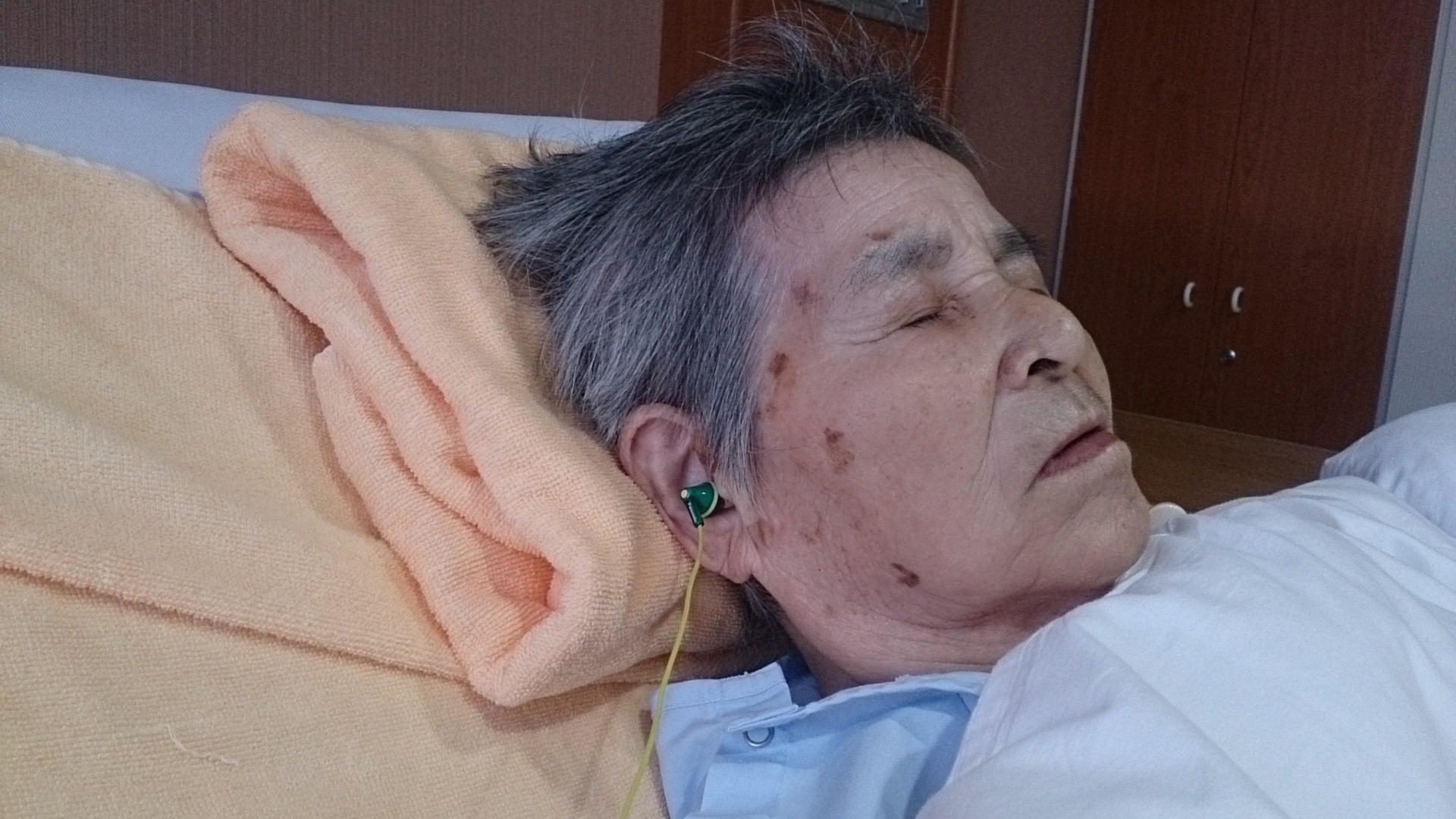 母の耳に イヤホーンを入れて